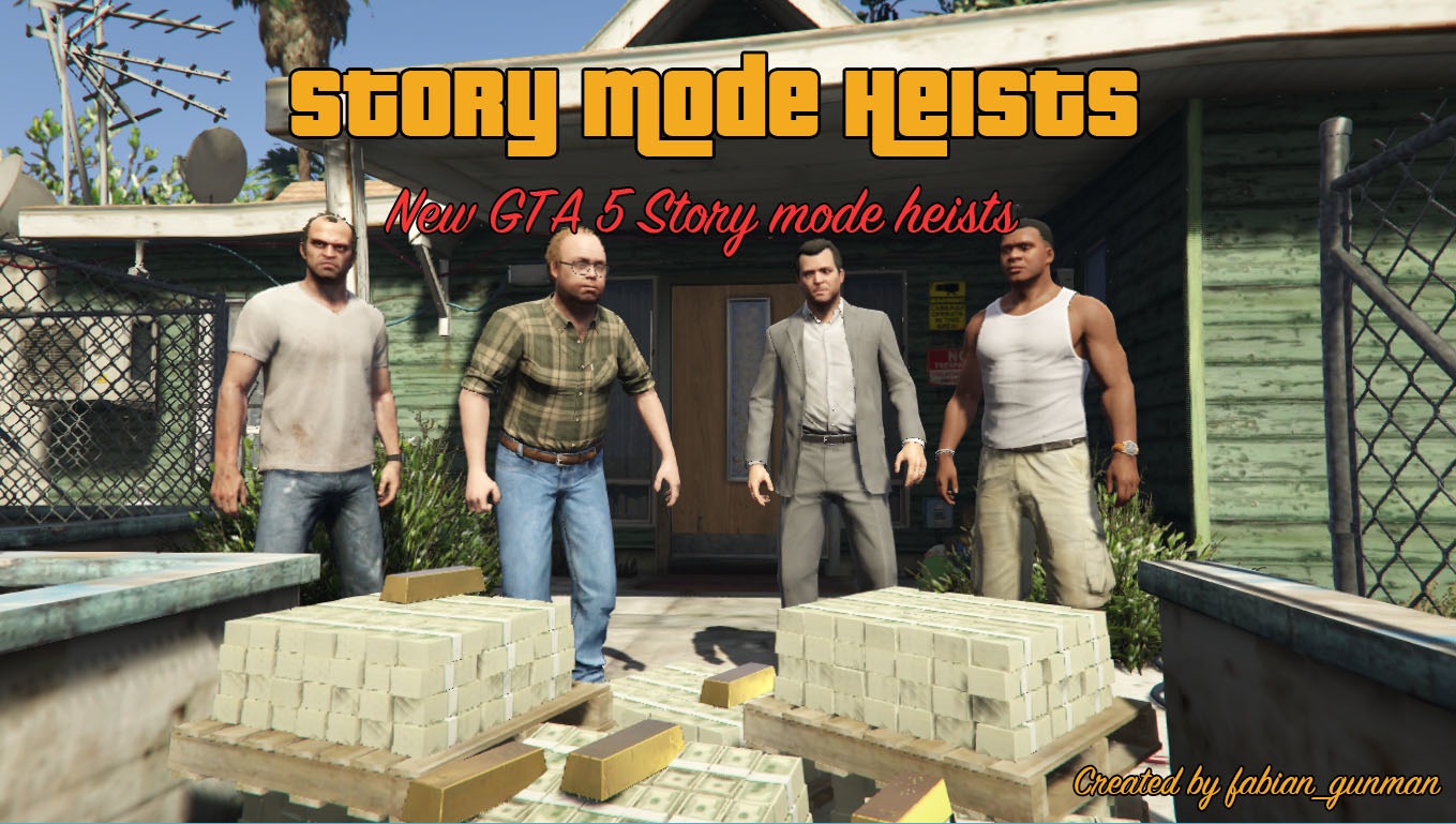 Story Mode Heists – данный мод добавляет абсолютно новые миссии ограблений в сюжетный режим GTA 5, за основу взяты ограбления из GTA Online. И так, данный мод добавляет 2 миссии, в каждой есть несколько подготовительный и финальная миссия.