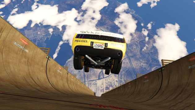 Получив эту рампу вы можете повеселиться прыгая с нее на различных машинах и мотоциклах, пытаясь долететь до земли, на хороших машинах спустившись вниз можно еще и далеко прыгнуть, на выходе с рампы есть трамплин.